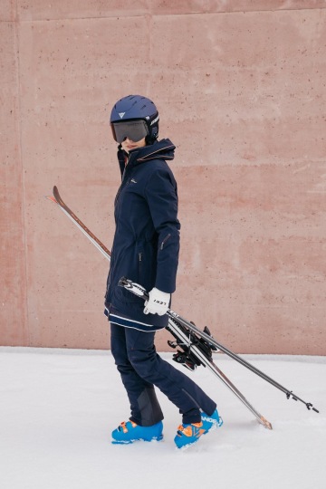 Dámská lyžařská parka 3v1: Dvě bundy, tři způsoby využití. Můžete nosti kařdou zvlášť nebo je navrstvit. Ochrání vás proti větru, dešti a díky peří příjemně zahřeje. Sofistikovaný připínací systém v rukávech a na zádech, aby vrstvy držely na svém místě. Detaily z tmavě modrého, károvaného lodenu na límci. Má prakticky celoroční využití.