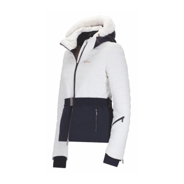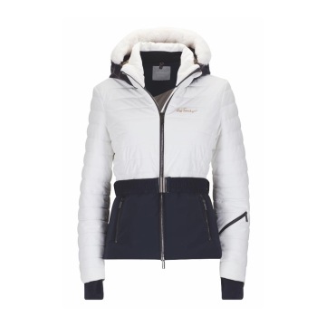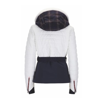 Elegantní dámská lyžařská bunda s páskem a kapucí s bohatou umělou kožešinou.