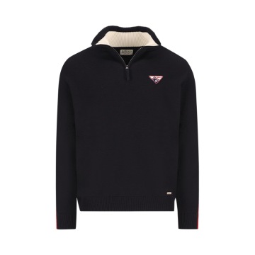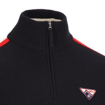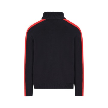 Tento pletený svetr se stojáčkem a krátkým zapínáním na zip je vyroben z pohodlné směsi merino vlny a je klasickým rolákem – styl, který původně nosili rybáři, a proto je také známý jako námořnický svetr. Barevný kontrast na límci, červené pruhy na rukávech a malá nášivka na levé straně hrudi s ikonickým číslem 42 – startovním číslem Luise Trenkera ve všech jeho lyžařských závodech – mu dodávají sportovní nádech.