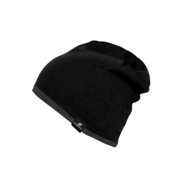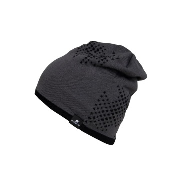 Unisex oboustranná pletená čepice. Z jedné strany tečkovaný motiv, z druhé strany jednodušší jednobarevné provedení. Štítek s logem na spodním lemu viditelný z obou stran.