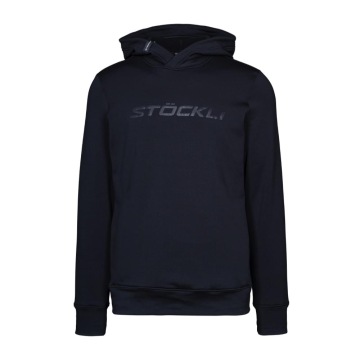 Detail: Embosované (reliéfní) logo Stöckli na hrudi, výšivka "S" logo na kapuci